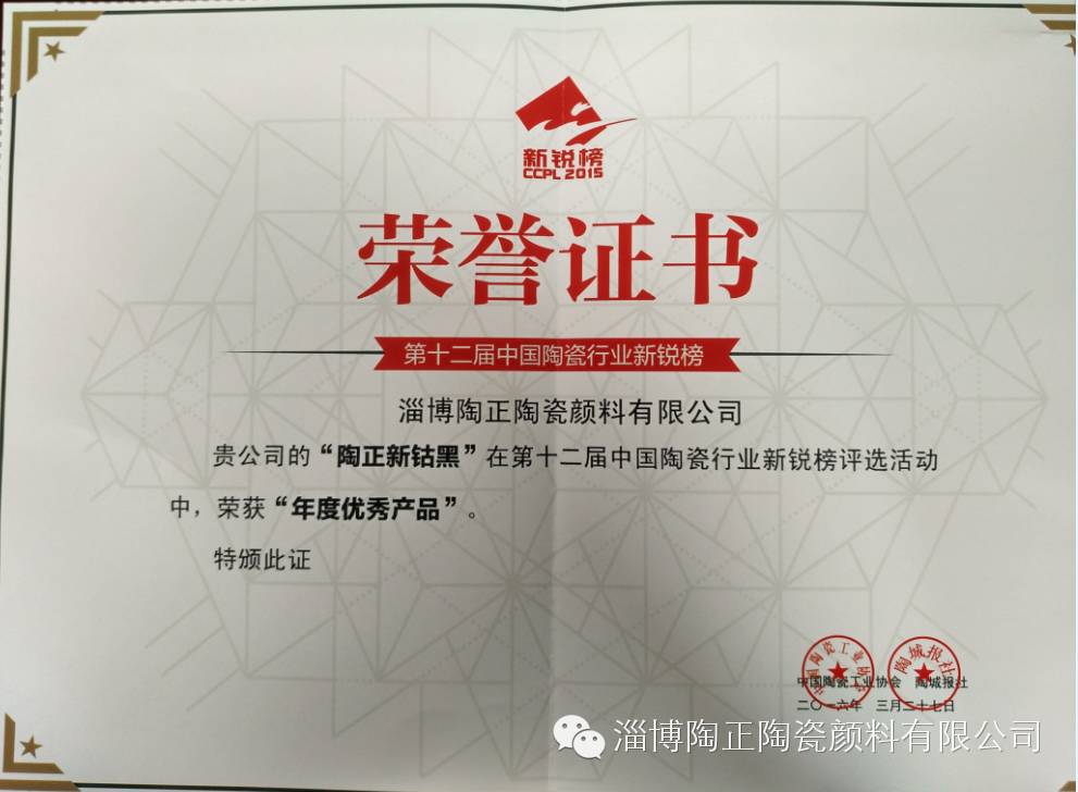 由媒体和专家以及资深业内人士组成的专业评审团历经一个多月终于评选出为中国陶瓷行业做出特殊贡献的企业和个人。淄博陶正陶瓷颜料有限公司“陶正新钴黑”产品凭借着优质的产品品质和良好的市场品牌口碑,在这一次评比中荣获“年度优秀产品”荣誉称号。